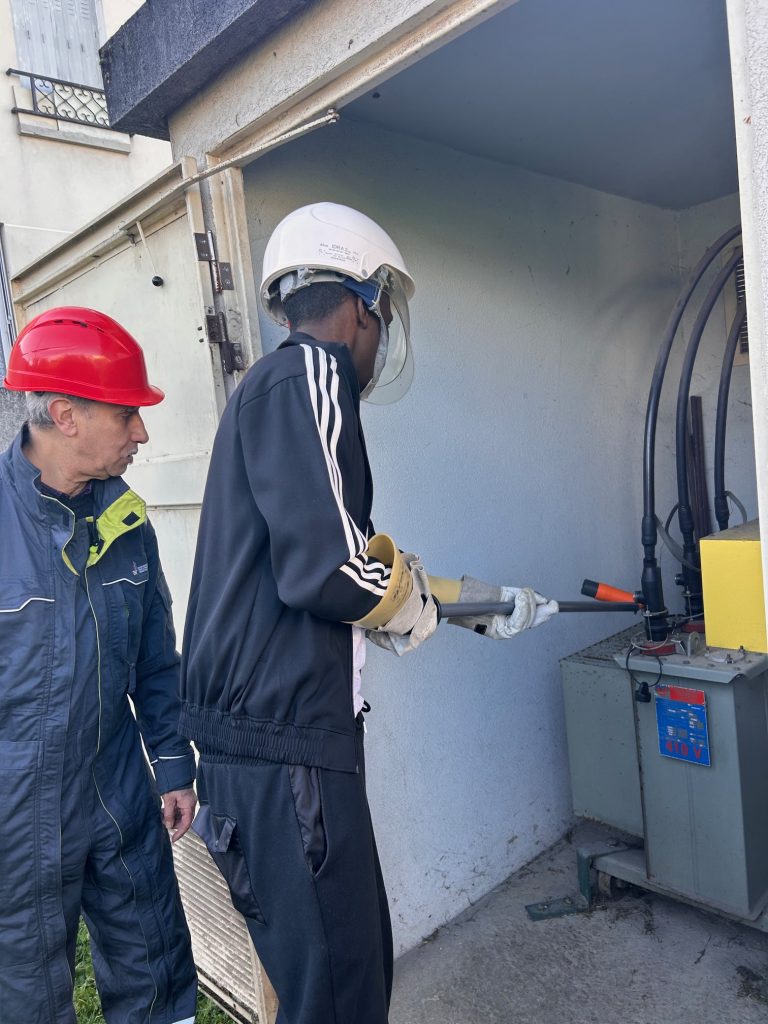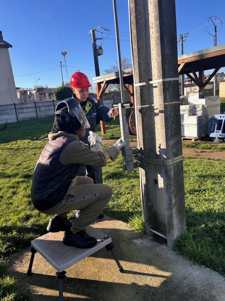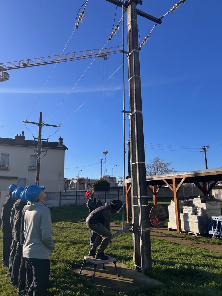 Cette intervention avait pour objectif de confronter les élèves à des situations professionnelles réelles et de les sensibiliser à la bonne attitude professionnelle à adopter lors d’interventions à proximité d’installations électriques sous tension. Encadrés par leurs formateurs, les élèves ont mis en œuvre les procédures de sécurité, le port des équipements de protection individuelle et l’utilisation de matériels spécifiques tels que les perches isolantes.